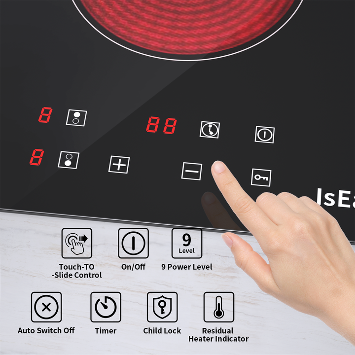 You can activate the functions by simply touching the buttons on the control panel. The 2-burner glass ceramic hob can essentially meet your daily cooking needs. Enjoy cooking with IsEasy glass ceramic hob!