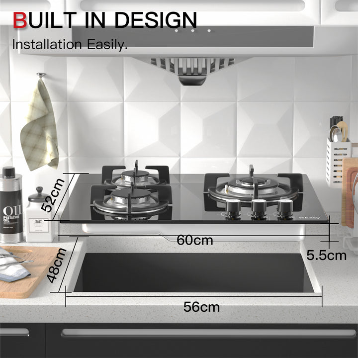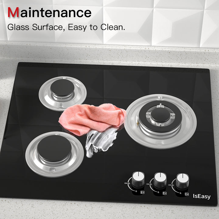 IsEasy 24" Glass Gas Hob, 3 Burners, NG/Propane Convertible, Automatic Thermocouple Protection, Built-in, 1.75 KW/2.7 KW/3.3 KW